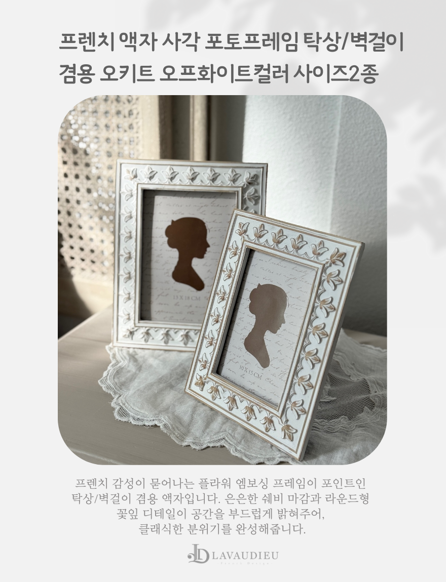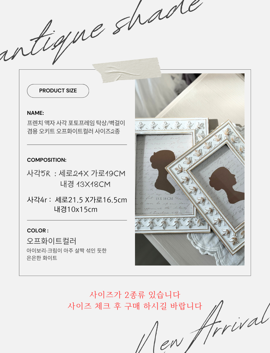 | 품명 | 프렌치 액자 사각 포토프레임 탁상/벽걸이 겸용 오키트 오프화이트컬러 사이즈2종 |