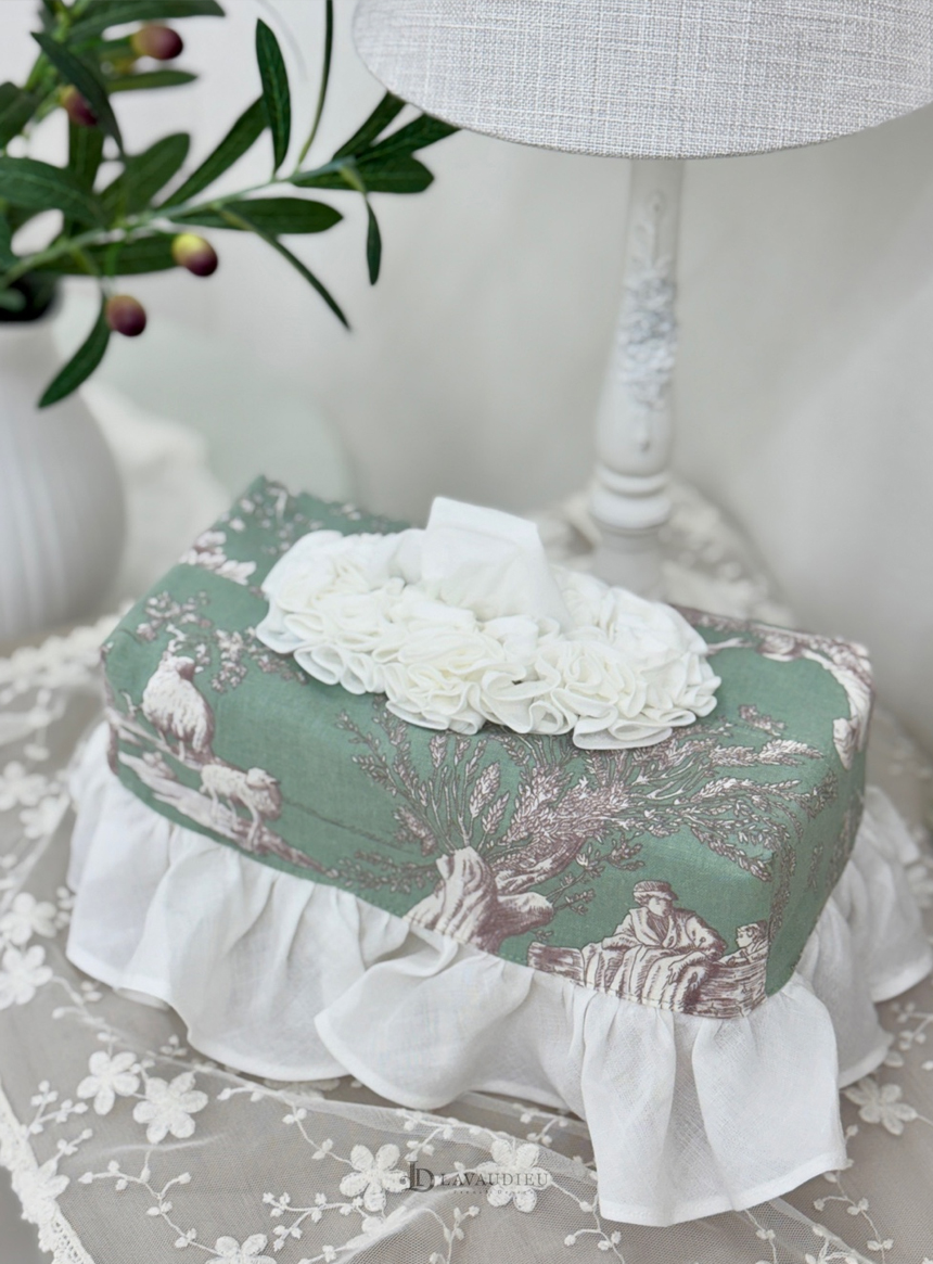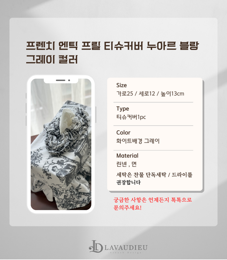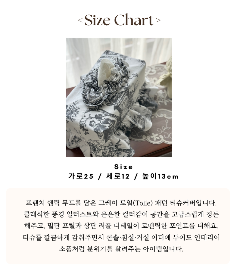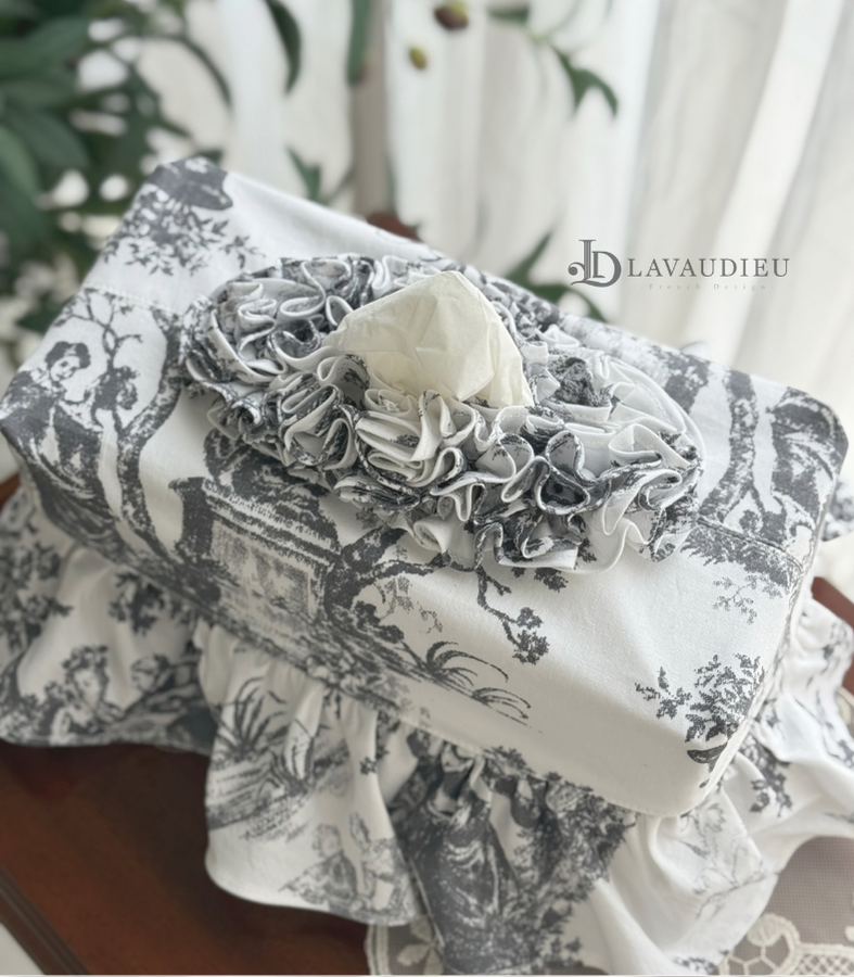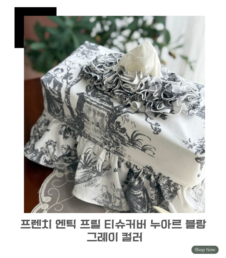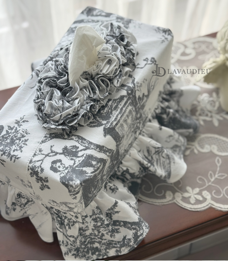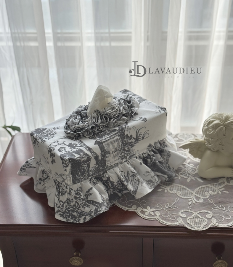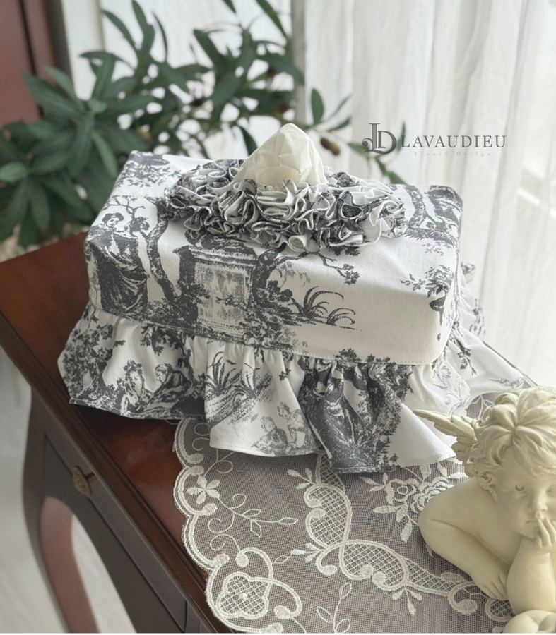 - HOME > 홈패브릭 커텐 발매트 > 티슈커버,식탁보 > 프렌치 엔틱 프릴 티슈 케이스 커버 누아르 블랑 그레이 컬러 인테리어 소품