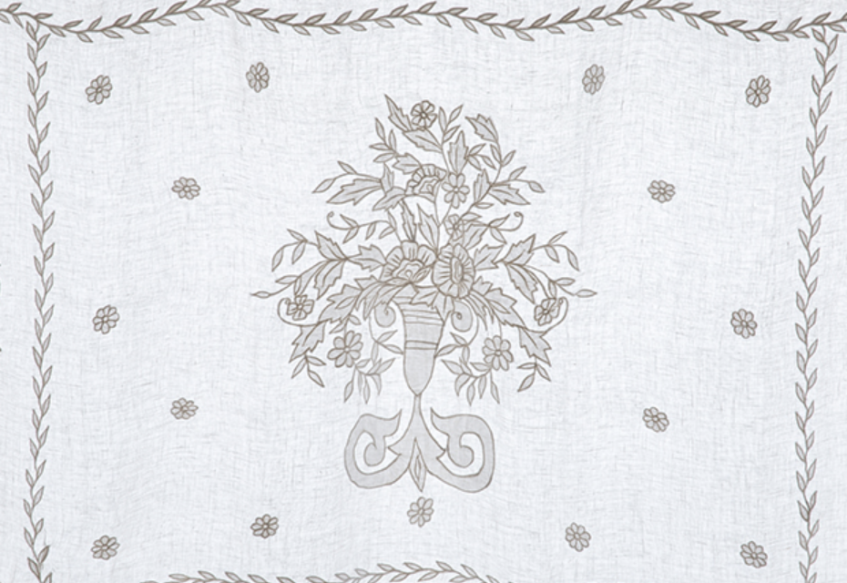 화이트 원단 위에 은은한 베이지 톤의 자수 실을 배색하여 빈티지한 무드를 살렸습니다.