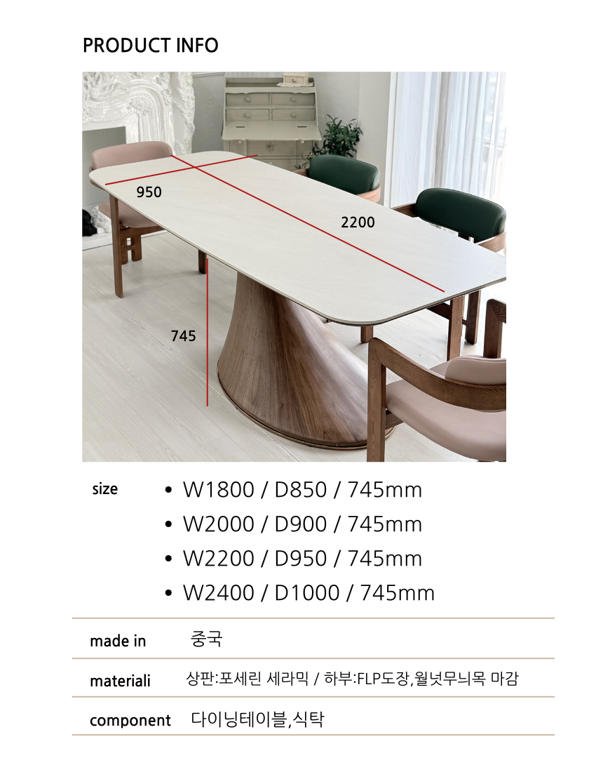 | 주요소재 | 상판:포세린 세라믹 / 하부:FLP도장,월넛무늬목 마감 |