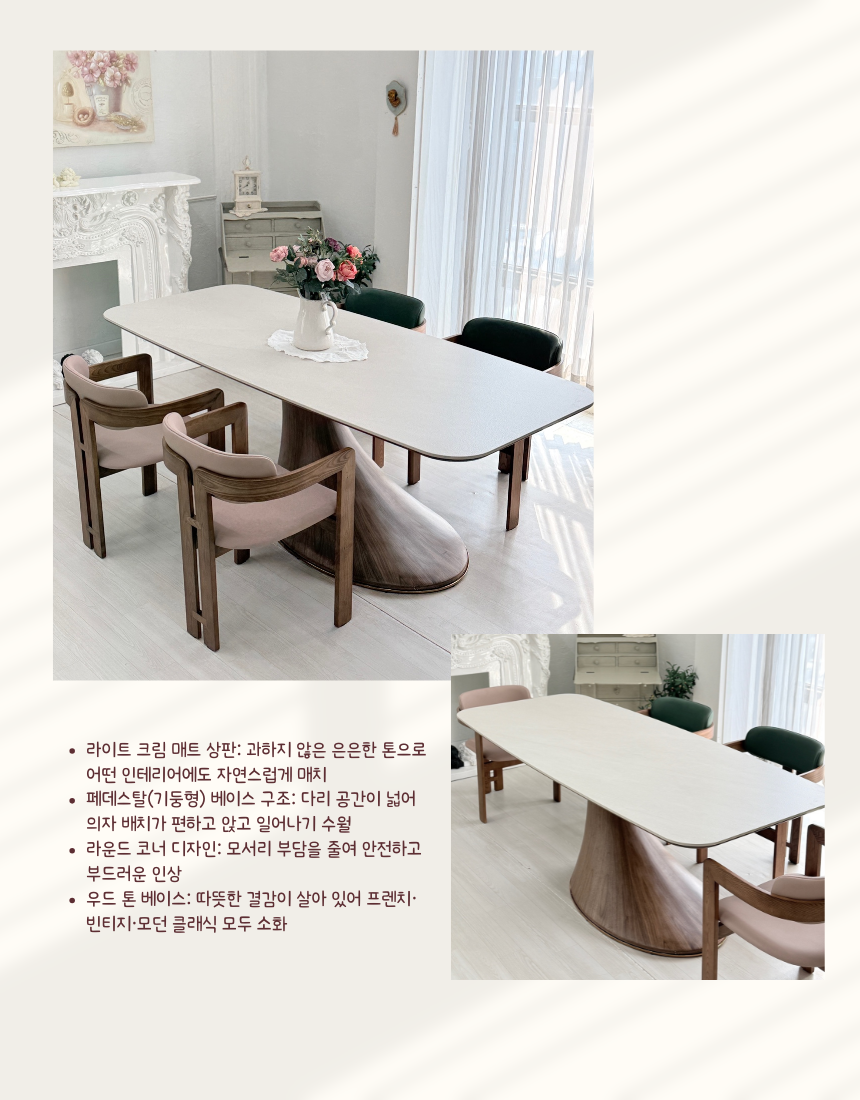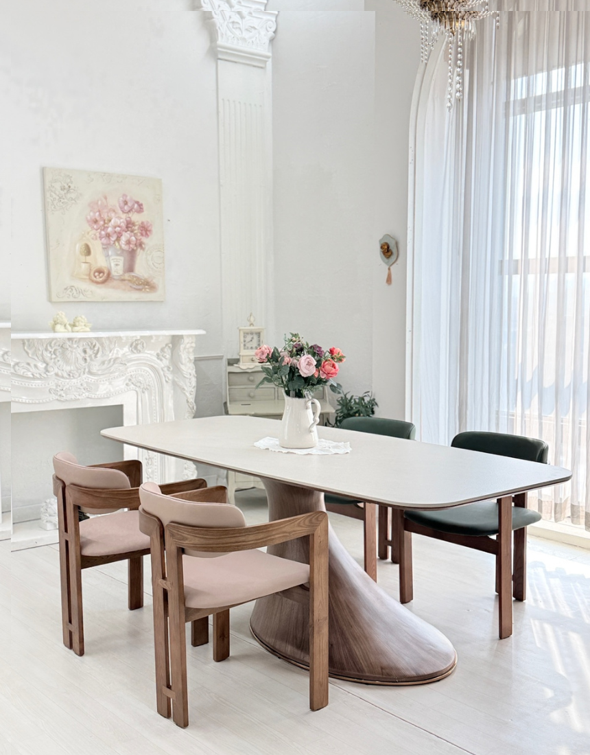 우드 체어·패브릭 체어를 믹스하면 카페 같은 부드러운 다이닝 무드를 손쉽게 연출할 수 있어요.