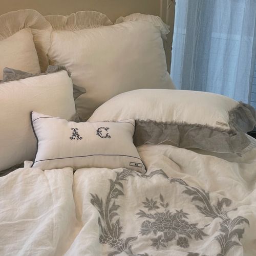 - 프렌치 스타일 린넨 그레이 자수 이불 커버 세트 침실 화이트 인테리어