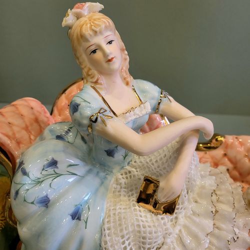 - 벤치에 앉은 여인과 새 피겨린 도자기/세라믹 인테리어 장식 오브제 피겨린 고급 세라믹 인테리어 도자기 장식 인형