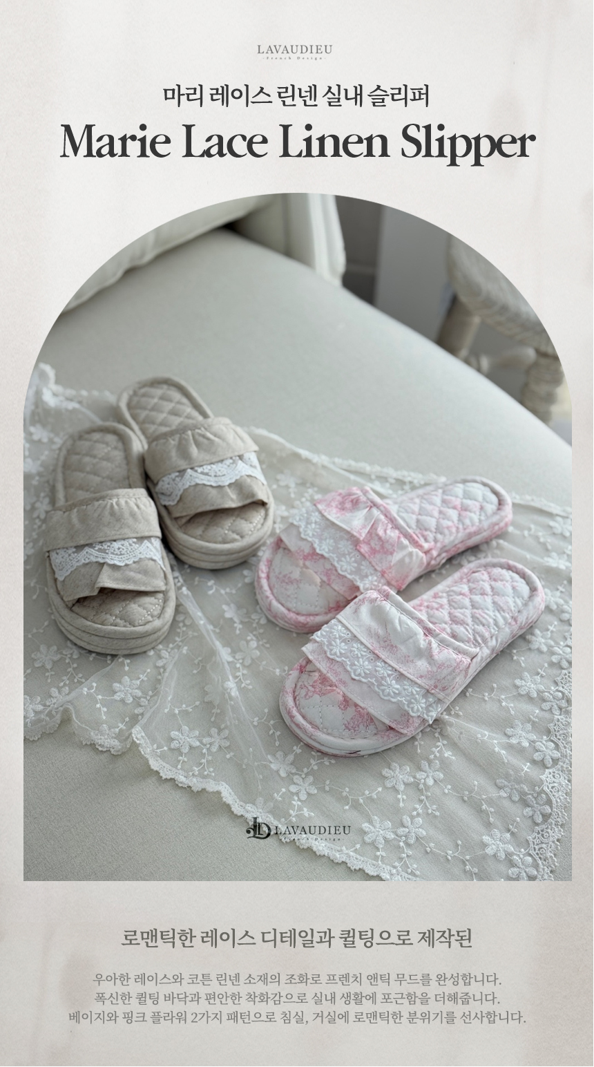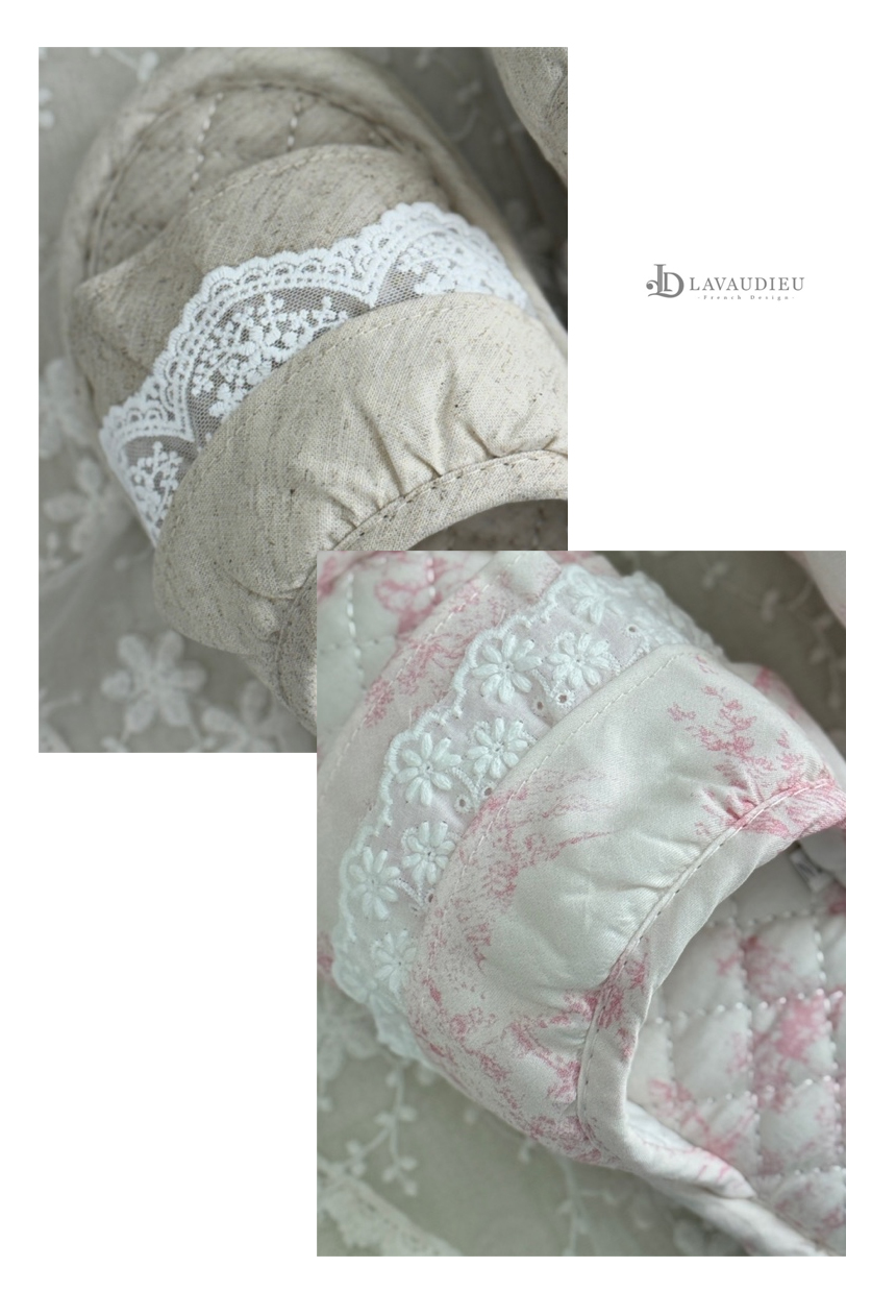 우아한 레이스와 코튼 린넨 소재의 조화로 프렌치 앤틱 무드를 완성합니다.